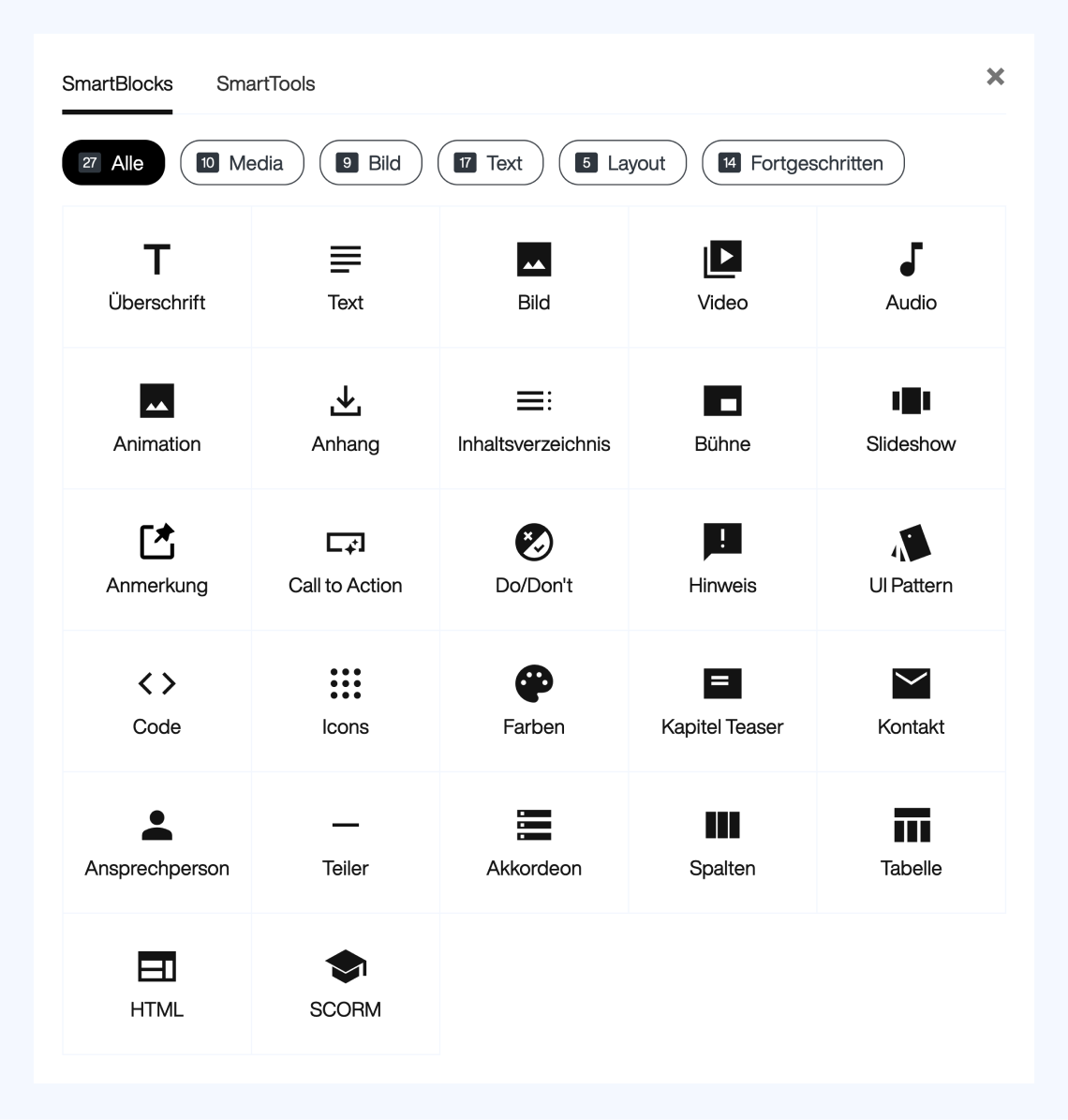 Wenn du eine Blanko-Seite erstellt hast, ist der erste Schritt ein neues Element zu erstellen. Du kannst aus 29 Smart-Blocks auswählen.